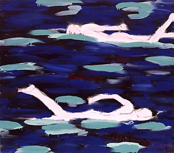 swimmers & water lilies through the years (1982–1990) – ultramarine swimmers, 140 x 160 cm acrylic on canvas, signed, dated