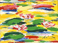 swimmers & water lilies through the years (1999–2006) – yellow waterlilies, 18 x 24 cm acrylic on canvas, signed, dated