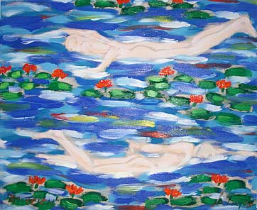 swimmers & water lilies through the years (1999–2006) – in the pond, 152 x 182 cm acrylic on canvas, signed, dated