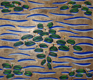 water lilies – gold, silver, copper (2020), 120 x 140 cm acrylic & metal leaf on canvas, signed, dated