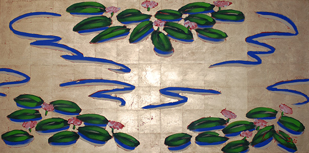 water lilies – gold, silver, copper (2020), 100 x 200 cm acrylic & metal leaf on canvas, signed, dated