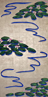 water lilies – gold, silver, copper (2020), 200 x 100 cm acrylic & metal leaf on canvas, signed, dated